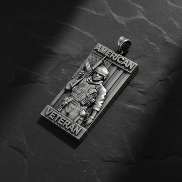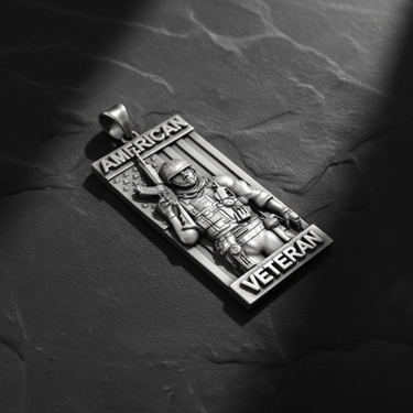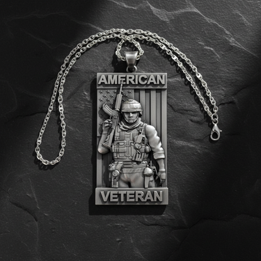 Stand with pride wearing this powerful American Veteran pendant, a three-dimensional tribute to modern warriors crafted in authentic 925 sterling silver. This extraordinary piece showcases a combat-ready soldier in full tactical gear, rendered with museum-quality detail from the ballistic helmet to the precision-molded rifle and tactical vest with magazine pouches. Every element of modern warfare equipment has been meticulously sculpted against the backdrop of the American flag, its stars and stripes symbolizing the freedom these heroes defend. The bold "AMERICAN VETERAN" inscription frames this powerful tribute in military dog tag style. The substantial weight and deep relief create shadows that bring this miniature sculpture to life. Perfect for Iraq and Afghanistan veterans, active-duty military, special operations personnel, or families honoring their modern warriors. A timeless recognition of sacrifice, courage, and the 21st-century American fighting spirit.