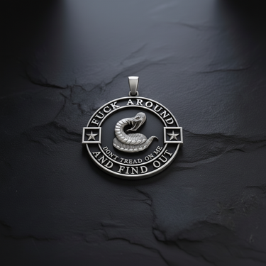 Make a defiant statement with this powerful Don't Tread on Me Pendant, expertly crafted from authentic 925 sterling silver. This bold piece features the iconic coiled rattlesnake from the historic Gadsden Flag, ready to strike in defense of liberty. The legendary "DON'T TREAD ON ME" motto encircles the serpent, while contemporary text adds modern edge to this timeless symbol of American independence and personal freedom. Two stars flank the design, representing the spirit of 1776. Available in classic oxidized silver or luxurious gold finish, every scale on the rattlesnake has been meticulously detailed in dimensional relief. Perfect for libertarians, patriots, Second Amendment supporters, veterans, and anyone who refuses to be pushed around. This substantial medallion represents self-reliance, individual liberty, and the warning that peaceful people, when provoked, will defend their freedom with unwavering resolve.