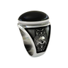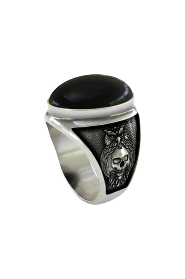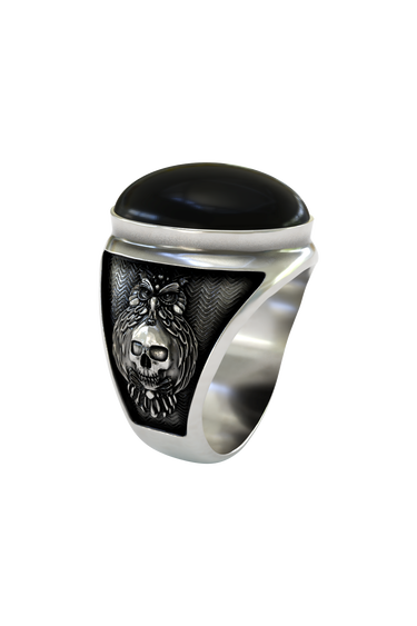 Embrace ancient wisdom with this captivating owl skull ring, masterfully crafted in premium 925 sterling silver. The design features a majestic owl perched protectively above a human skull, symbolizing the eternal connection between wisdom and mortality. Intricate chevron patterns create a mesmerizing backdrop, while detailed feather work showcases exceptional artistry. The large black onyx stone crowns this powerful piece, representing the mysteries of the night. Perfect for those who appreciate deep symbolism and gothic aesthetics, this ring channels the mystical energy of the wise owl. Each feather is meticulously carved, creating a stunning interplay of light and shadow that makes this piece truly unforgettable.