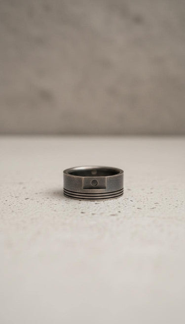 Clean your sterling silver piston ring with a soft polishing cloth to maintain its lustrous finish. Store in a dry place away from chemicals and moisture. The oxidized detailing will develop a natural patina over time, enhancing the authentic mechanical appearance.