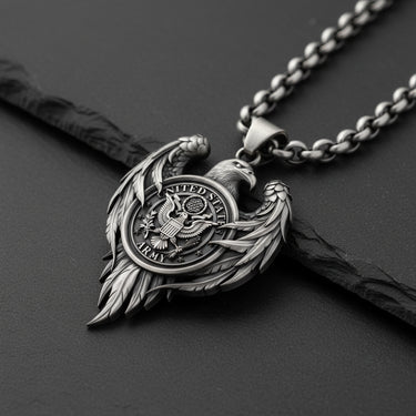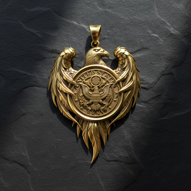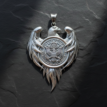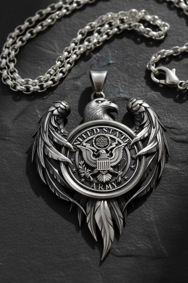 Celebrate Army pride with this magnificent US Army Eagle Pendant, expertly crafted from authentic 925 sterling silver. This commanding piece features a powerful eagle with outstretched wings protectively embracing the official United States Army seal at its center. The circular medallion showcases the Great Seal eagle emblem surrounded by "UNITED STATES ARMY" text, while the guardian eagle's detailed wings flow majestically downward with every feather meticulously carved in stunning dimensional relief. The eagle's fierce talons grip the Army seal, symbolizing strength and unwavering protection. Available in distinguished oxidized silver or prestigious gold finish, this substantial pendant honors the world's most powerful land force. Perfect for Army veterans, active duty soldiers, Army families, and patriots who support those who defend freedom on the ground. This We'll Defend—with pride cast in silver and honor worn on the chest.