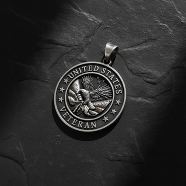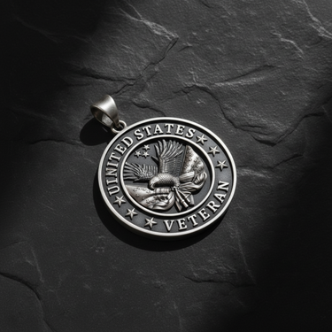 Honor those who served with this distinguished United States Veteran pendant, expertly crafted in authentic 925 sterling silver. The centerpiece features a majestic American eagle with outstretched wings, powerfully grasping the Stars and Stripes, symbolizing freedom and the courage of those who defended it. The bold inscription "UNITED STATES VETERAN" encircles the design, framed by nine stars representing valor, sacrifice, honor, loyalty, duty, integrity, service, courage, and commitment. Available in both oxidized antique silver for a heritage aesthetic or luxurious 24K gold plating for a distinguished look. The substantial bail accommodates chains up to 6mm, while the 13-gram weight ensures premium quality. Perfect for veterans of all branches, military families, or anyone honoring American service members. A timeless tribute to those who answered the call.