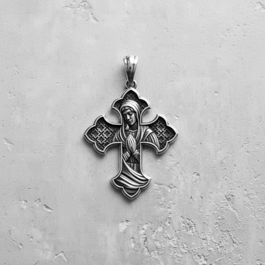 Embrace divine grace with this exquisite Virgin Mary Cross Pendant, masterfully crafted from authentic 925 sterling silver. This sacred piece features the Blessed Mother in reverent prayer, her serene figure elegantly sculpted within a stunning quatrefoil cross frame. Intricate Orthodox cross patterns adorn each of the four arms, creating a mesmerizing backdrop that honors Byzantine spiritual tradition. Mary's flowing robes and gentle prayer pose radiate peace and maternal protection, while the oxidized background enhances every delicate detail. Available in classic antiqued silver or warm rose gold finish, this substantial pendant serves as both a powerful devotional symbol and an heirloom-quality treasure. Perfect for daily prayer, honoring Marian feast days, or gifting to those devoted to Our Lady. A meaningful expression of faith that connects generations through unwavering devotion to the Mother of God.