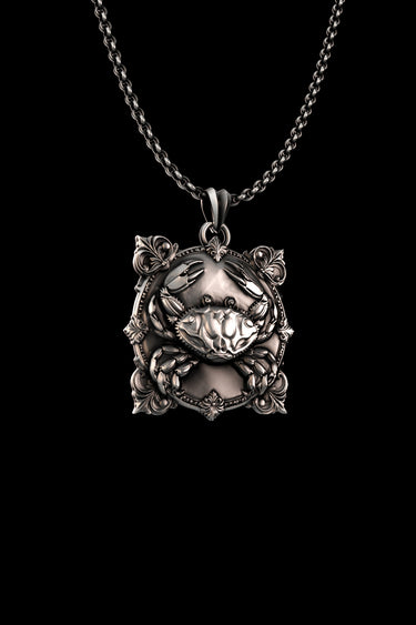 Embrace oceanic beauty with this stunning crab pendant, a masterwork of marine artistry crafted in premium 925 sterling silver. This exquisite crab pendant features a beautifully detailed crab with ornate Victorian-style frame adorned with fleur-de-lis corners and decorative scrollwork. The crab pendant showcases incredible anatomical accuracy: each claw meticulously sculpted, textured shell with realistic segments, stalked eyes, and eight walking legs—all captured in extraordinary three-dimensional detail. The oxidized finish creates depth and contrast, highlighting every detail of this crab pendant from the delicate leg joints to the powerful claws. For Cancer zodiac (June 21-July 22), this crab pendant represents intuition, emotional depth, protection, and home. Beyond astrology, this crab pendant symbolizes adaptability, defense mechanisms, regeneration, and connection to ocean tides. This crab pendant serves as both zodiac jewelry and marine life appreciation, perfect for Cancer sun signs, ocean lovers, and coastal enthusiasts.