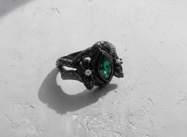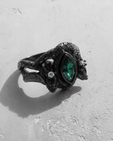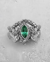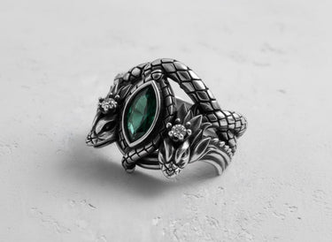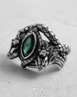 Unleash the might of legend with this breathtaking silver dragon ring, a masterpiece of fantasy-inspired design. Two intricately detailed dragons stand guard, their scaled bodies wrapping to form the band, while their heads frame a mesmerizing marquise-cut emerald gemstone. Meticulously handcrafted from solid 925 sterling silver, this ring offers a substantial feel and enduring quality, serving as the perfect canvas for the lustrous gold and rose gold vermeil finishes. Every scale and claw is brought to life by our skilled artisans, creating a powerful statement piece. Ideal for lovers of mythology and high fantasy, this silver dragon ring is a wearable work of art that captures the spirit of mythical power. It's more than jewelry; it's a talisman of strength and a symbol of your unique story.