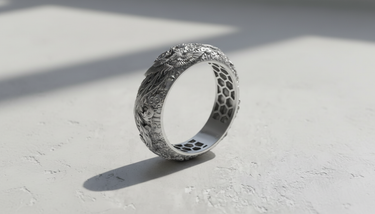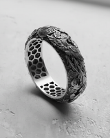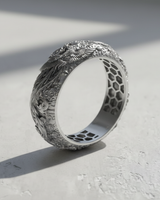 Top-down view of the handcrafted Dragon Phoenix Ring in 925 silver, highlighting the unique interior honeycomb pattern and band width. Top-down view of the handcrafted Dragon Phoenix Ring in 925 silver, highlighting the unique interior honeycomb pattern and band width.