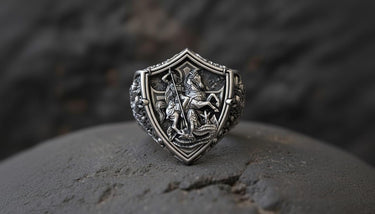 Our handcrafted dragon slayer ring showcases St. George on horseback wielding his lance against the mighty dragon, all enclosed within an ornate heraldic shield. The detailed relief work includes textured scales, flowing robes, and dynamic battle poses that demonstrate exceptional silversmith artistry. Each element is meticulously carved to create depth and visual impact.