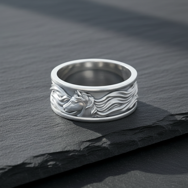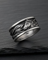 Capture the unbridled spirit of the wild with this magnificent silver horse ring. Expertly handcrafted from premium 925 sterling silver, this band features a stunning high-relief depiction of a stallion, its mane flowing dynamically as if caught in a gallop across open plains. The intricate detailing highlights the horse's noble expression and raw strength, while the expert oxidized finish adds striking depth and contrast to the textured design. Ideally suited for equestrian enthusiasts and those who embody a free spirit, this silver horse ring makes a bold statement of individuality and power. Whether chosen as a meaningful gift for a horse lover or a personal totem of freedom, this durable piece combines timeless equestrian style with superior artisanal craftsmanship to create a truly unique accessory.