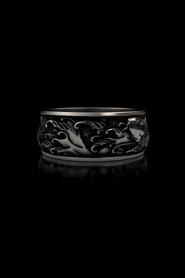 Studio render of a 925 sterling Silver Koi Fish Ring on a black background, highlighting the swimming koi and wave details. Studio render of a 925 sterling Silver Koi Fish Ring on a black background, highlighting the swimming koi and wave details.