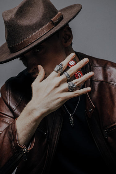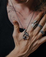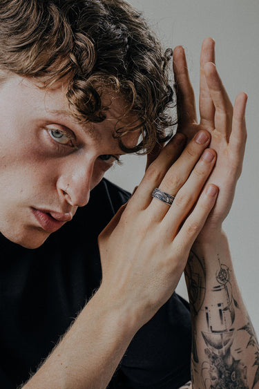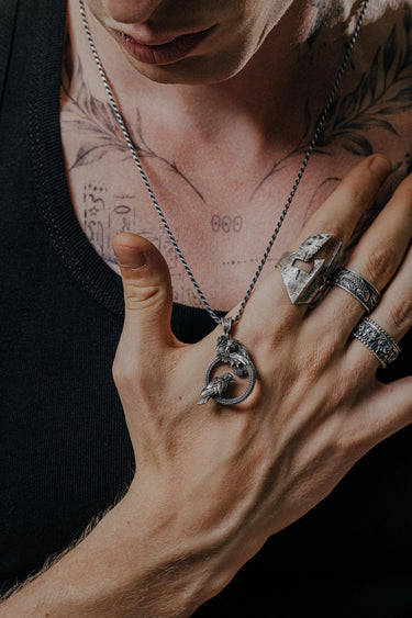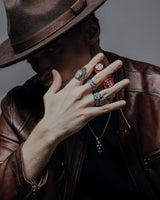 Process: Silver is treated with oxidation to create natural darkening in recessed areas, emphasizing the handcrafted details and giving each piece a vintage, mystical appearance.