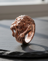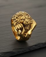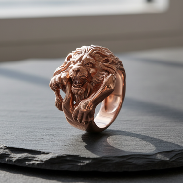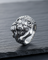 Handcrafted 925 sterling silver roaring lion ring displaying intricate mane details on textured black slate background Handcrafted 925 sterling silver roaring lion ring displaying intricate mane details on textured black slate background