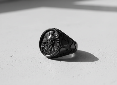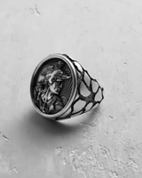 Oxidized sterling silver rooster ring side view, showcasing the detailed warrior cameo and the unique web-patterned band. Oxidized sterling silver rooster ring side view, showcasing the detailed warrior cameo and the unique web-patterned band.