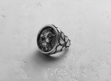 Channel the vigilance and courage of ancient myth with our masterfully crafted Silver Rooster Ring. This exceptional piece features a striking oval cameo, showcasing a noble warrior bust adorned with a rooster-crested helmet, a powerful symbol of dawn and renewal. Behind the figure, a radiant sunburst design emanates strength, set against a backdrop of finely detailed waves. Each element is meticulously carved by our skilled artisans from solid 925 sterling silver, with an oxidized finish that accentuates the incredible depth and texture of the artwork. The unique, web-patterned band adds a contemporary edge to its classical inspiration, ensuring comfort and a commanding presence. Perfect for lovers of mythology and history, this signet-style Silver Rooster Ring is more than just jewelry—it's a wearable piece of art that tells a story of strength and honor.