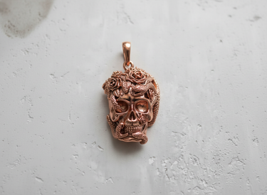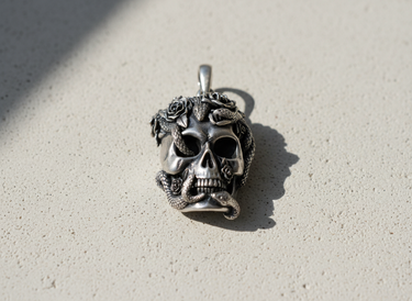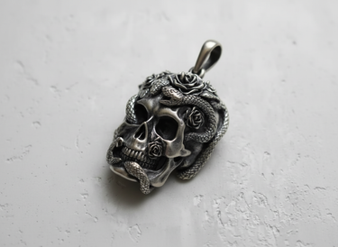Unveil a powerful symbol of transformation with this masterfully crafted Silver Skull Snake Pendant. This striking piece captures the eternal dance between life and death, featuring a meticulously detailed skull entwined with a coiling serpent and crowned with delicate roses. Each element, from the snake's textured scales to the flower's petals, is brought to life by skilled artisans using premium 925 sterling silver. An oxidized finish adds dramatic depth, accentuating the intricate details and creating a weathered, gothic appeal. This bold Silver Skull Snake Pendant is more than just jewelry; it's a statement of fearless individuality, perfect for those drawn to biker, rock, or dark romantic styles. Wear it as a daily reminder of life's cyclical nature and the beauty found within its complexities, a timeless heirloom that speaks to a rebellious spirit.