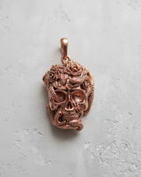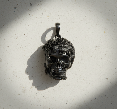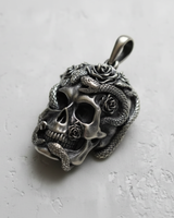 Embrace the powerful symbolism of life, death, and eternal cycles with our masterfully crafted Silver Skull Snake Pendant. This exceptional piece features a detailed human skull intricately entwined with a coiling serpent and crowned with blooming roses, a trinity of potent icons. Each element, from the snake’s textured scales to the delicate flower petals, is meticulously sculpted from solid 925 sterling silver by skilled artisans. An oxidized finish is expertly applied to create dramatic contrast, highlighting the profound depth and gothic character of the design. Perfect for those with a biker aesthetic or an appreciation for Memento Mori art, this Silver Skull Snake Pendant is a bold statement of individuality and resilience. It’s not just an accessory; it’s a wearable masterpiece that tells a story of transformation and untamed spirit.