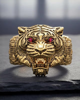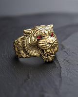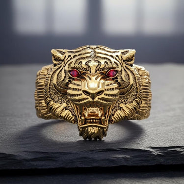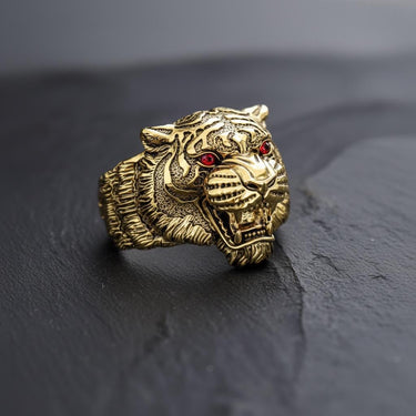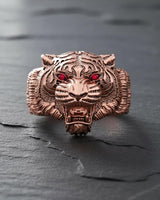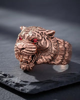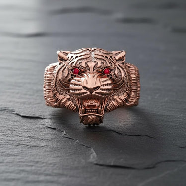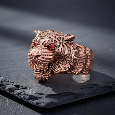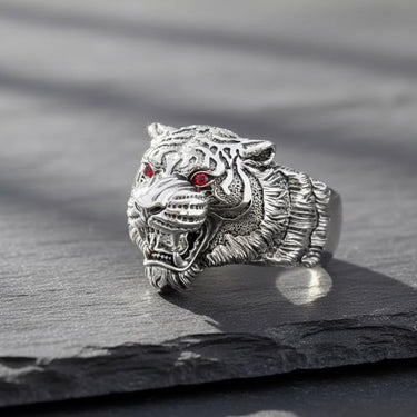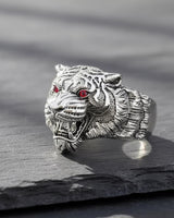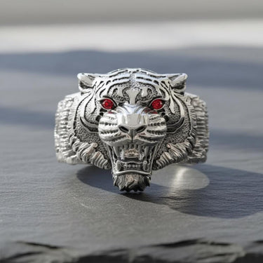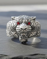 Channel the untamed spirit of the wild with this commanding Silver Tiger Ring. Meticulously sculpted from solid 925 sterling silver, this piece captures the raw power and ferocity of the jungle's apex predator. The design features a highly detailed, snarling tiger head, brought to life by a dark oxidized finish that accentuates every stripe and whisker. Fiery red gemstone eyes add a captivating glint of intensity, creating an unforgettable focal point. Expertly handcrafted by skilled artisans, the substantial weight and intricate details speak to its superior quality. This bold statement ring is perfect for the modern man seeking to express confidence and individuality, making it an ideal accessory for biker or gothic styles. Wear this exceptional Silver Tiger Ring as a symbol of courage, strength, and fearless determination.