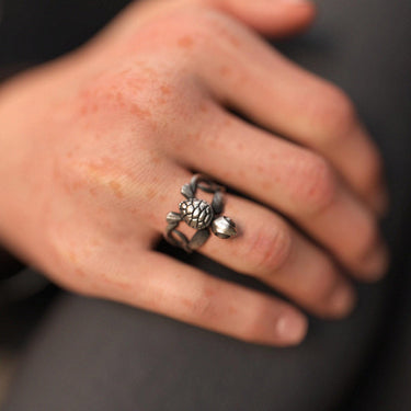 Carry the wisdom and longevity of the sea with our masterfully crafted Silver Turtle Ring. This enchanting piece features a meticulously detailed sea turtle, a timeless symbol of good fortune and endurance, resting upon an intricately woven band that evokes the gentle flow of ocean currents. Expertly handcrafted from premium 925 sterling silver, the ring's oxidized finish accentuates every nuance, from the delicate patterns on the turtle's shell to the fluid lines of the band. Its unique and thoughtful design offers a comfortable, adjustable fit, making it a meaningful piece of spiritual jewelry and a perfect good luck charm. Whether worn as a daily reminder of resilience or as a unique statement piece, this Silver Turtle Ring is a wearable talisman of perseverance. Embrace its serene energy and add a touch of handcrafted artistry to your collection.