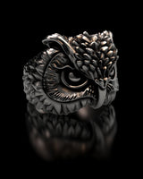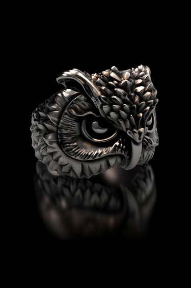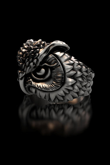 Channel ancient wisdom with this extraordinary 925 sterling silver owl ring. Masterfully sculpted with incredible attention to detail, this captivating piece features a majestic owl with intricately layered feathers that create stunning dimensional depth. The piercing eyes and sharp beak embody the owl's legendary vigilance and intelligence. Each feather is individually crafted, showcasing exceptional artistry in the oxidized finish that highlights every texture. Weighing 13 grams, this substantial ring makes a powerful statement about wisdom and protection. Perfect for nature lovers, spiritual seekers, or anyone drawn to the mystical symbolism of owls. Transform your style with this remarkable fusion of natural beauty and sterling silver craftsmanship.