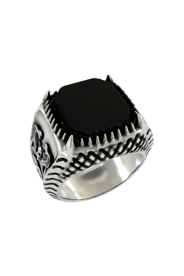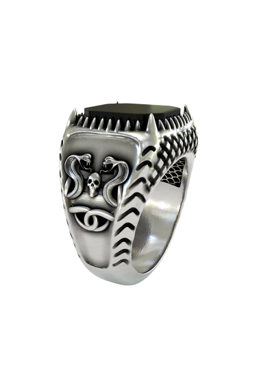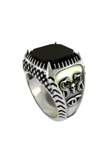 Embrace ancient mysticism with this captivating serpent skull ring, expertly crafted in premium 925 sterling silver. Twin snakes coil protectively around a central skull, symbolizing eternal life, wisdom, and transformation. The sleek black onyx stone crowns this masterpiece, while razor-sharp spikes create a dramatic bezel setting. Intricate geometric patterns and chevron details flow across the band, adding depth and texture to this gothic statement piece. Perfect for those who appreciate dark symbolism and serpentine power, this ring channels primordial energy. Each serpent scale is meticulously detailed, creating a mesmerizing interplay of light and shadow that makes this piece truly unforgettable.