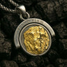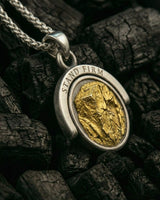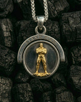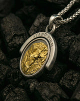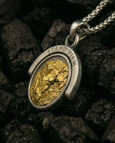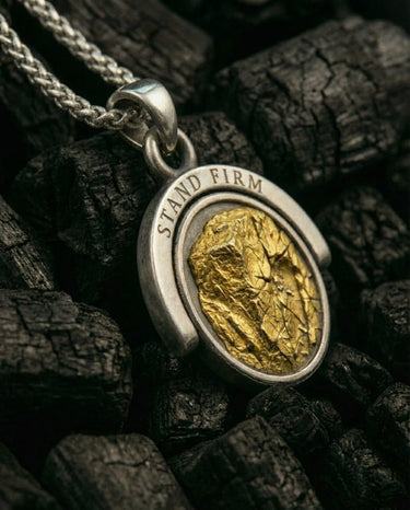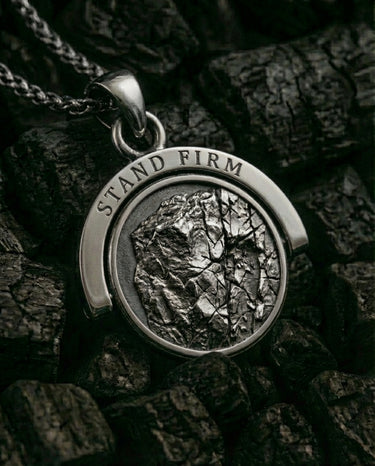 Stand unshakeable with our Stone rotating pendant, a powerful testament to inner strength crafted in 925 sterling silver. This remarkable double-sided medallion draws inspiration from 1 Corinthians 15:58, encouraging the wearer to remain steadfast and immovable in faith and purpose. One face reveals a raw, textured golden rock symbolizing unbreakable foundation, while the reverse displays a resolute figure standing with crossed arms—the embodiment of unwavering determination. The engraved "Stand Firm" inscription encircles both designs, serving as a daily reminder of your inner fortress. The innovative rotating mechanism lets you choose which powerful symbol to display. With its striking contrast of oxidized silver and radiant gold-tone details, this pendant transforms biblical wisdom into wearable art that empowers and inspires.