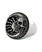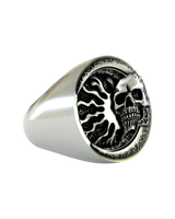 Ignite your rebellious spirit with this powerful 925 sterling silver flaming skull signet ring. This bold statement piece features a meticulously detailed skull emerging from dancing flames, creating a mesmerizing contrast between life and death. The circular signet design showcases a unique textured border that adds depth and character, while the polished silver finish gleams against the oxidized details. Weighing 13 grams, this substantial ring sits perfectly on the finger, commanding attention with its fierce presence. Perfect for bikers, gothic style enthusiasts, or anyone who embraces the darker side of fashion. Transform your style with this exceptional fusion of mortality symbolism and premium sterling silver craftsmanship that speaks to the eternal rebel within.
