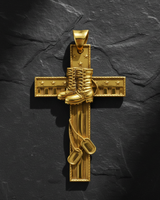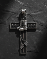 Honor American military service with this powerful American Veteran's Cross Pendant, masterfully crafted from authentic 925 sterling silver. This iconic piece features the legendary battlefield cross configuration: combat boots standing at attention as a symbol of service, dog tags representing identity and sacrifice, and the American flag's stars adorning the horizontal bar to honor the nation defended. Every detail carries deep military meaning—the upright boots symbolize the soldier's final formation, the suspended dog tags honor individual service, and the cross itself represents the burden carried by all who serve. Textured vertical lines flow down the cross like a rifle barrel, honoring the warrior's oath. Available in distinguished oxidized silver or prestigious gold finish, this substantial pendant serves as a tribute to all American veterans—past, present, and future. Perfect for veterans, active duty, military families, and patriots honoring those who answered the call.