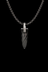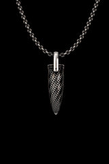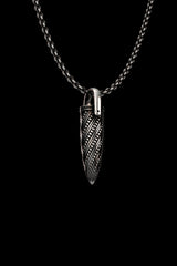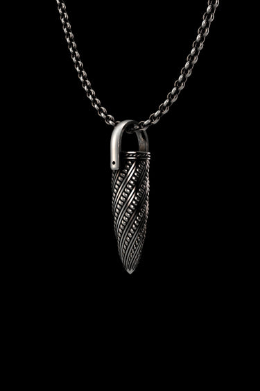 Embrace bold style with this striking bullet pendant, masterfully handcrafted in authentic 925 sterling silver. The sleek bullet-shaped design features intricate diagonal geometric patterns that spiral elegantly around the entire surface, creating a mesmerizing visual effect. Each engraved line is meticulously carved, enhanced with oxidized finishing that brings dimensional depth to every detail. The bullet shape represents focus, direction, and unstoppable momentum—a powerful symbol for those who pursue their goals with determination. This substantial pendant combines edgy aesthetics with refined craftsmanship, making it perfect for anyone seeking distinctive jewelry that makes a statement. Whether you're drawn to its bold masculine appeal, geometric precision, or symbolic meaning of strength and purpose, this versatile piece transcends trends to become a signature accessory. A conversation-starting pendant that commands attention while maintaining sophisticated elegance.