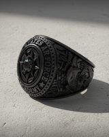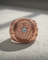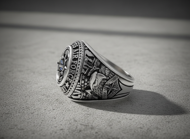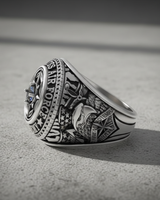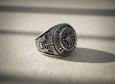 Honor a legacy of excellence with our masterfully crafted Silver Air Force Academy Ring. This distinguished piece serves as a powerful symbol of dedication, achievement, and service. Cast in solid 925 sterling silver, the ring features intricate details, from the proud eagle and shield on the shank to the bold 'UNITED STATES AIR FORCE ACADEMY' lettering encircling the face. At its heart lies a striking compass rose design, centered with a brilliant gemstone, representing guidance and precision. The oxidized finish artfully enhances every line and symbol, creating a look of timeless prestige. Perfect as a graduation gift or a cherished keepsake for alumni, this ring is more than jewelry—it's a piece of history. Wear this exceptional Silver Air Force Academy Ring with pride, a constant reminder of the values it represents.