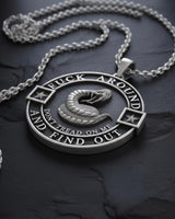 Silver Gadsden pendant with oxidized finish and detailed rattlesnake on matching chain necklace