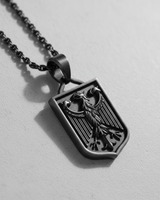 Display your heritage with pride wearing this distinguished Silver German Eagle Pendant. The design features the iconic Bundesadler, the German Federal Eagle, set prominently within a classic shield silhouette. Meticulously handcrafted from premium 925 sterling silver, the pendant showcases intricate detailing in the eagle's feathers and the vertical striped background, highlighted by a dark oxidized finish that adds striking depth and contrast to the polished surfaces. This piece serves as a powerful symbol of strength and history, making it an ideal accessory for history enthusiasts or a meaningful patriotic gift for men who appreciate heraldic jewelry. Whether worn daily as a statement piece or reserved for special occasions, this durable silver German eagle pendant combines traditional heraldry with modern craftsmanship, ensuring it stands the test of time. Elevate your personal style with this timeless coat of arms design that perfectly captures the spirit of unity and sovereignty.