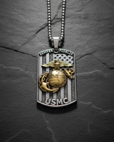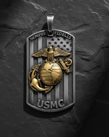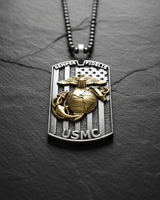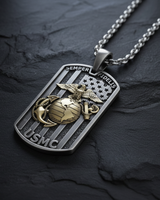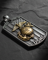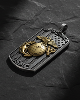 Celebrate Marine Corps pride with this exceptional USMC Pendant Stars and Stripes Flag, masterfully crafted from authentic 925 sterling silver. This patriotic dog tag design features the legendary Eagle, Globe, and Anchor emblem in brilliant gold relief, rising prominently from an American flag backdrop of stars and stripes. The iconic "SEMPER FIDELIS" motto frames the top edge while "USMC" anchors the bottom, creating a complete tribute to Marine heritage. Thirteen oxidized silver stripes represent the original colonies, while a field of raised stars symbolizes American unity. The two-tone finish combines luxurious gold detailing with classic silver, delivering maximum visual impact. Perfect for Marines past and present, military families, and proud patriots who honor those who serve. This substantial pendant serves as both a symbol of unwavering loyalty and a reminder that freedom isn't free.