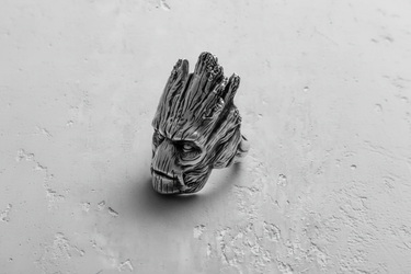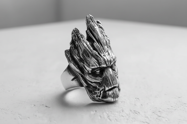 Channel the resilience of nature with this incredible handcrafted silver Groot ring. Expertly sculpted from premium 925 sterling silver, this unique piece captures the iconic visage of the beloved tree guardian in stunning, lifelike detail. The ring showcases intricate bark-like textures and deep grooves, accentuated by a dark oxidized finish or black rhodium plating that adds depth and character to the wooden facial features. A perfect accessory for comic book enthusiasts and fans of the Guardians of the Galaxy, this statement ring blends pop culture fandom with luxury jewelry craftsmanship. The robust band ensures a comfortable fit for daily wear, making it an ideal gift for him or a bold addition to your own collection. Stand out with this silver Groot ring, a symbol of loyalty and strength that brings a touch of cinematic magic to your style.