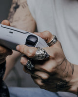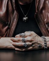 Process: Silver is treated with oxidation to create natural darkening in recessed areas, emphasizing the handcrafted details and giving each piece a vintage, mystical appearance.