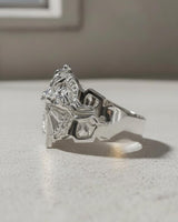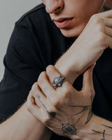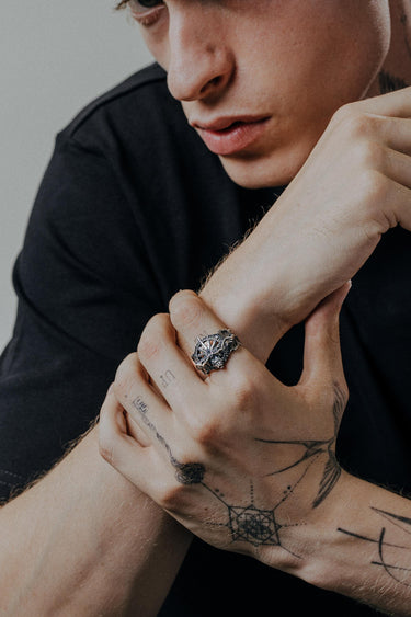 Three-quarter angle of the Silver Ring of Lucii, highlighting the intricate sculptural details and band depth on a light surface. Three-quarter angle of the Silver Ring of Lucii, highlighting the intricate sculptural details and band depth on a light surface.
