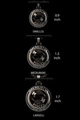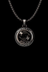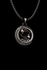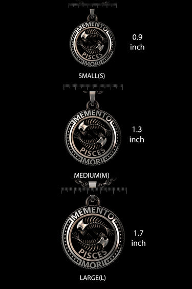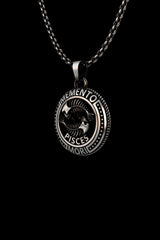 Dive into the mystical depths of Pisces with this enchanting memento mori medallion, masterfully crafted in authentic 925 sterling silver. This spiritual piece merges zodiac symbolism with philosophical wisdom, featuring two intricately detailed fish skeletons swimming in eternal harmony at the center, surrounded by the Latin inscriptions "MEMENTO" and "MORI" alongside bold "PISCES" text. The dual fish represent the intuitive and compassionate nature of this mutable water sign, while the skeletal imagery reminds you to embrace life's spiritual journey with Piscean depth and empathy. The flowing curves create dynamic movement and dimensional artistry, while the oxidized finish enhances every delicate bone detail against polished silver raised lettering. The rope-textured border frames this mystical statement piece with artisan excellence. Perfect for February and March birthdays, this pendant serves as both a personal astrological talisman and a meaningful reminder to navigate life with Pisces' characteristic wisdom and creativity.