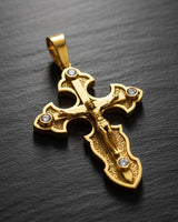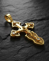 Rose gold plated crucifix pendant showing ornate religious design with cubic zirconia crystal accents