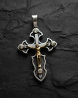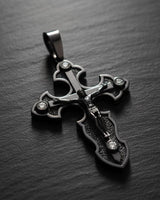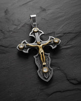 Black oxidized silver crucifix pendant displaying intricate Christian cross metalwork and stone details