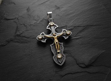 925 sterling silver crucifix pendant with detailed Jesus figure and CZ stones on dark wooden surface 925 sterling silver crucifix pendant with detailed Jesus figure and CZ stones on dark wooden surface