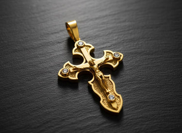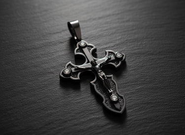 Black oxidized silver crucifix pendant displaying intricate Christian cross metalwork and stone details Black oxidized silver crucifix pendant displaying intricate Christian cross metalwork and stone details