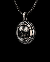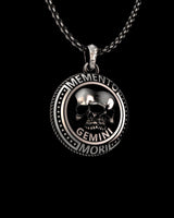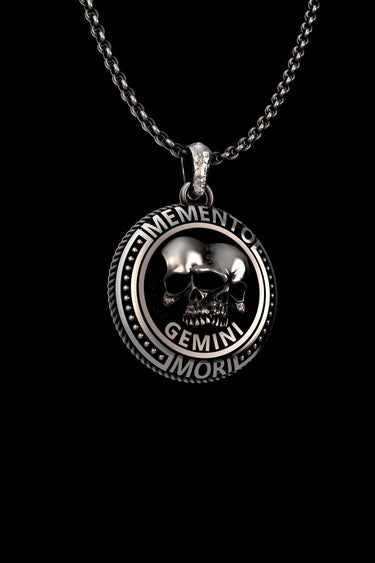 Channel the duality of your Gemini nature with this striking 925 sterling silver pendant featuring twin skulls in a memento mori design. Each pendant is meticulously handcrafted with "MEMENTO MORI" and "GEMINI" inscribed around the circular border, creating a powerful statement piece that celebrates both astrology and philosophical symbolism. The oxidized sterling silver finish enhances the dramatic contrast of the twin skulls, while the detailed border work showcases superior craftsmanship. Available in multiple sizes from 0.4 to 1.7 inches, this Gemini pendant perfectly suits any style preference. Ideal for astrology enthusiasts and those drawn to meaningful jewelry, this sterling silver pendant serves as a daily reminder of life's precious nature and your zodiac identity.