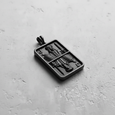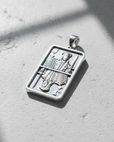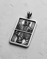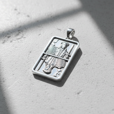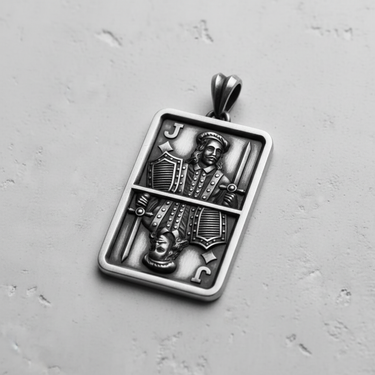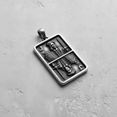 Hold a winning hand with our masterfully crafted Silver Jack Pendant, a bold tribute to the classic playing card. This unique piece captures the timeless allure of the Jack, meticulously detailed in a mirrored design complete with his sword and shield. Forged from premium 925 sterling silver, the pendant's substantial feel and intricate relief carving showcase exceptional artistry. The oxidized finish adds a dramatic depth, accentuating every line and contour of the iconic figure. Perfect for card players, game enthusiasts, or anyone seeking a distinctive accessory, this playing card pendant makes a powerful statement. Whether as a personal good luck charm or a thoughtful gift, this Silver Jack Pendant combines sophisticated style with a touch of rebellious spirit, elevating any look with its unique character and superior craftsmanship.
