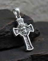 Top-down view of the 925 sterling silver Jesus cross pendant, showing the detailed facial features and ornate scrollwork. Top-down view of the 925 sterling silver Jesus cross pendant, showing the detailed facial features and ornate scrollwork.