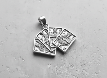 Hold a winning hand close to your heart with our masterfully crafted Silver Playing Card Pendant. This exceptional piece showcases a fanned-out display of the four kings, each rendered with meticulous attention to detail, from their royal crowns to their intricate regalia. Forged from premium 925 sterling silver, the pendant features a skillfully applied oxidized finish that accentuates the depth and character of each monarch, bringing the iconic designs to life. It’s more than just jewelry; it's a symbol of strategy, power, and a touch of luck. Perfect for poker enthusiasts or anyone seeking a unique accessory that makes a bold statement. Whether worn daily or for a special game night, this sterling silver card pendant is a testament to superior craftsmanship and timeless style, making our Silver Playing Card Pendant the ultimate ace up your sleeve.