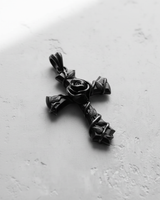 Oxidized sterling silver rose cross pendant with detailed leaves and petals, angled view on a light grey background. Oxidized sterling silver rose cross pendant with detailed leaves and petals, angled view on a light grey background.