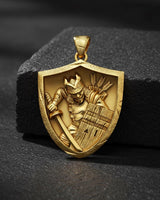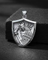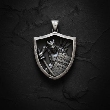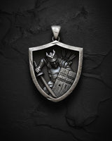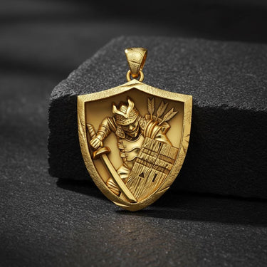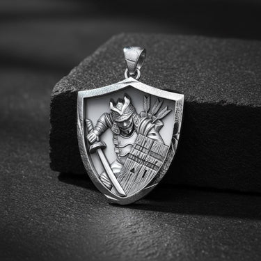 Honor the ancient code of Bushido with this exceptional silver samurai shield pendant crafted from premium 925 sterling silver. This striking warrior pendant features intricate relief detailing showcasing a fierce samurai in traditional armor wielding a katana, beautifully balanced with Japanese architectural elements including a pagoda and delicate cherry blossoms. Master artisans have meticulously carved every detail, from the warrior's ornate helmet to the textured shield surface, creating a three-dimensional masterpiece that captures the essence of Japanese honor and strength. Available in luxurious rose gold plating, classic silver, and bold black finishes, this samurai pendant makes an ideal gift for martial arts enthusiasts, Japanese culture admirers, or anyone seeking unique symbolic jewelry that represents courage, discipline, and warrior spirit.