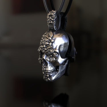 Close-up of sugar skull pendant featuring intricate flower carvings and premium sterling silver finish