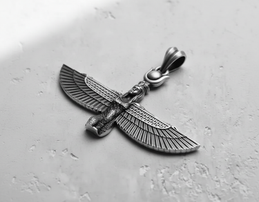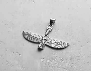Embody divine protection and feminine power with our masterfully crafted Winged Goddess Pendant. Inspired by the ancient deities of Egypt, this exquisite piece features a goddess figure with magnificent, outstretched wings, detailed with individual feathers that capture the light. Atop her head rests a symbolic sun disk, representing creation and sovereignty. Meticulously handcrafted from premium 925 sterling silver, this pendant showcases superior artistry in every curve and line. Its substantial feel and intricate design make it a powerful statement piece and a meaningful talisman. Perfect for enthusiasts of mythology or anyone seeking a unique spiritual accessory, this silver Winged Goddess Pendant is a timeless heirloom that connects the wearer to the mystique of a bygone era. Wear it as a symbol of magic, healing, and grace.