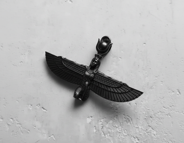 Oxidized 925 sterling silver Winged Goddess Pendant showing the contrast and depth of the intricate ancient Egyptian design.