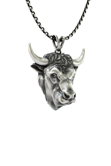 Side angle view of the Sterling Silver Taurus Bull Pendant, highlighting the polished horns and detailed fur texture. Side angle view of the Sterling Silver Taurus Bull Pendant, highlighting the polished horns and detailed fur texture.