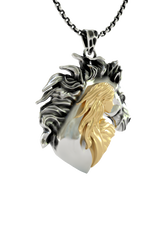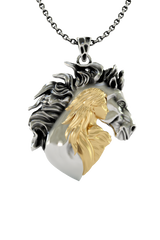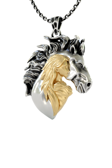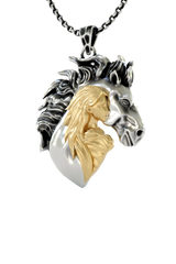 Celebrate the eternal bond between woman and horse with this stunning Woman Horse Pendant, expertly crafted in authentic 925 sterling silver with luxurious gold vermeil accents. This unique design captures the profound connection shared between rider and steed, featuring a graceful female silhouette rendered in warm gold that flows seamlessly into a powerful horse head, unified within a symbolic heart shape. The flowing mane showcases intricate oxidized detailing, creating dramatic contrast against polished surfaces. This two-tone masterpiece represents trust, freedom, and mutual respect. Perfect for equestrian enthusiasts, horse trainers, and anyone who understands the magical relationship between human and horse. A meaningful statement piece that speaks to the soul of every horse lover.